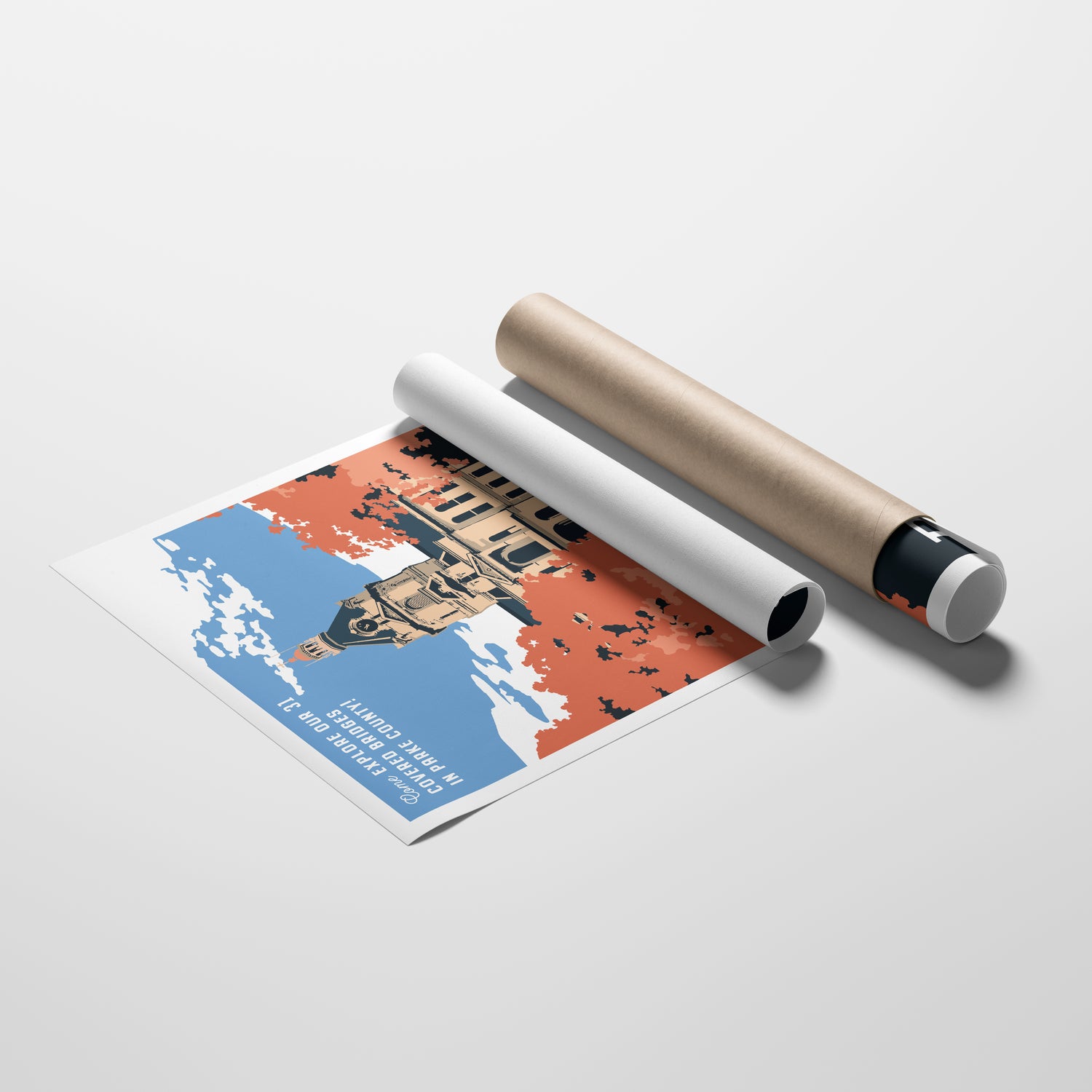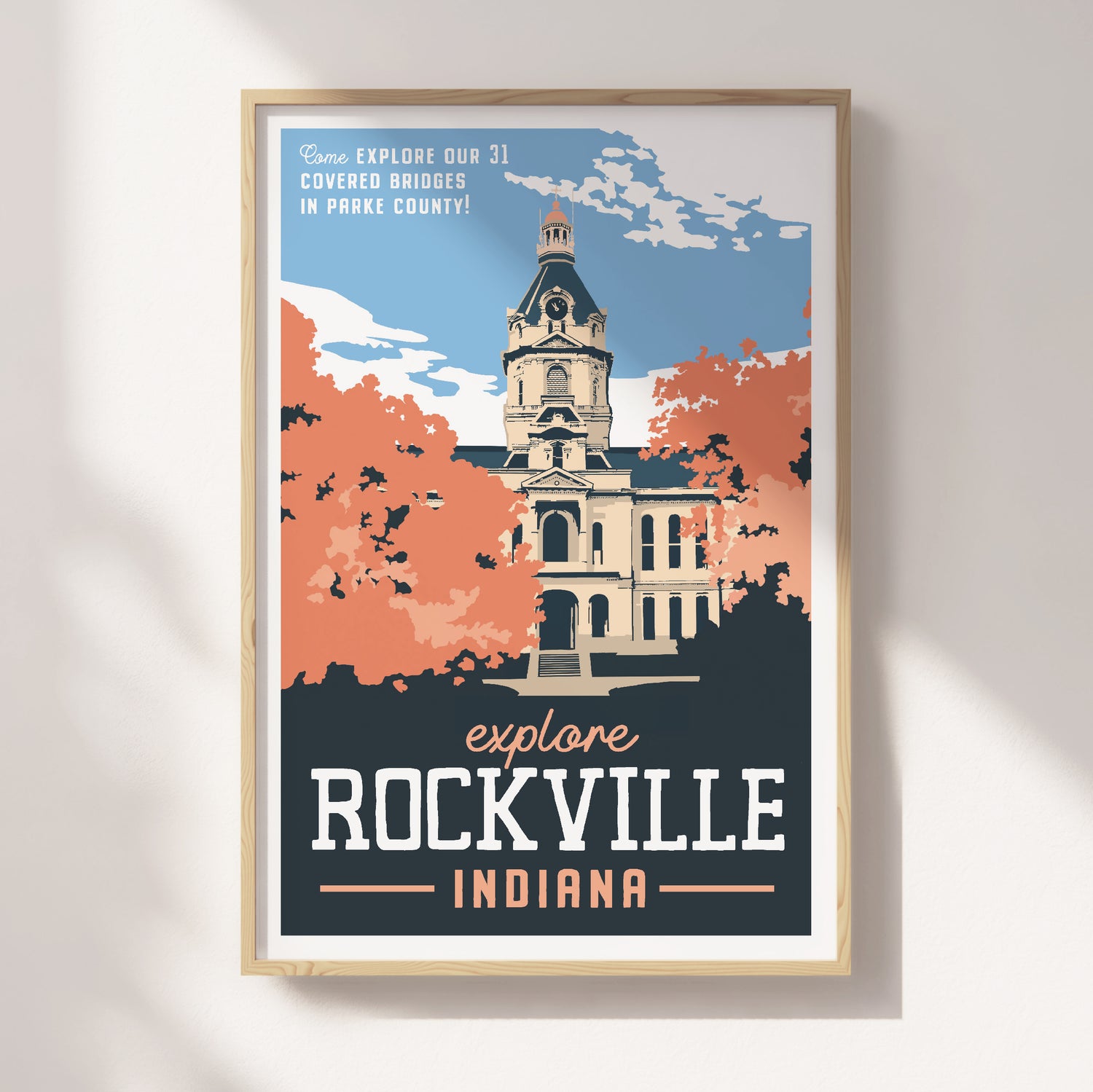 Hand drawn travel poster of Rockville, Indiana printed on beautiful matte paper.