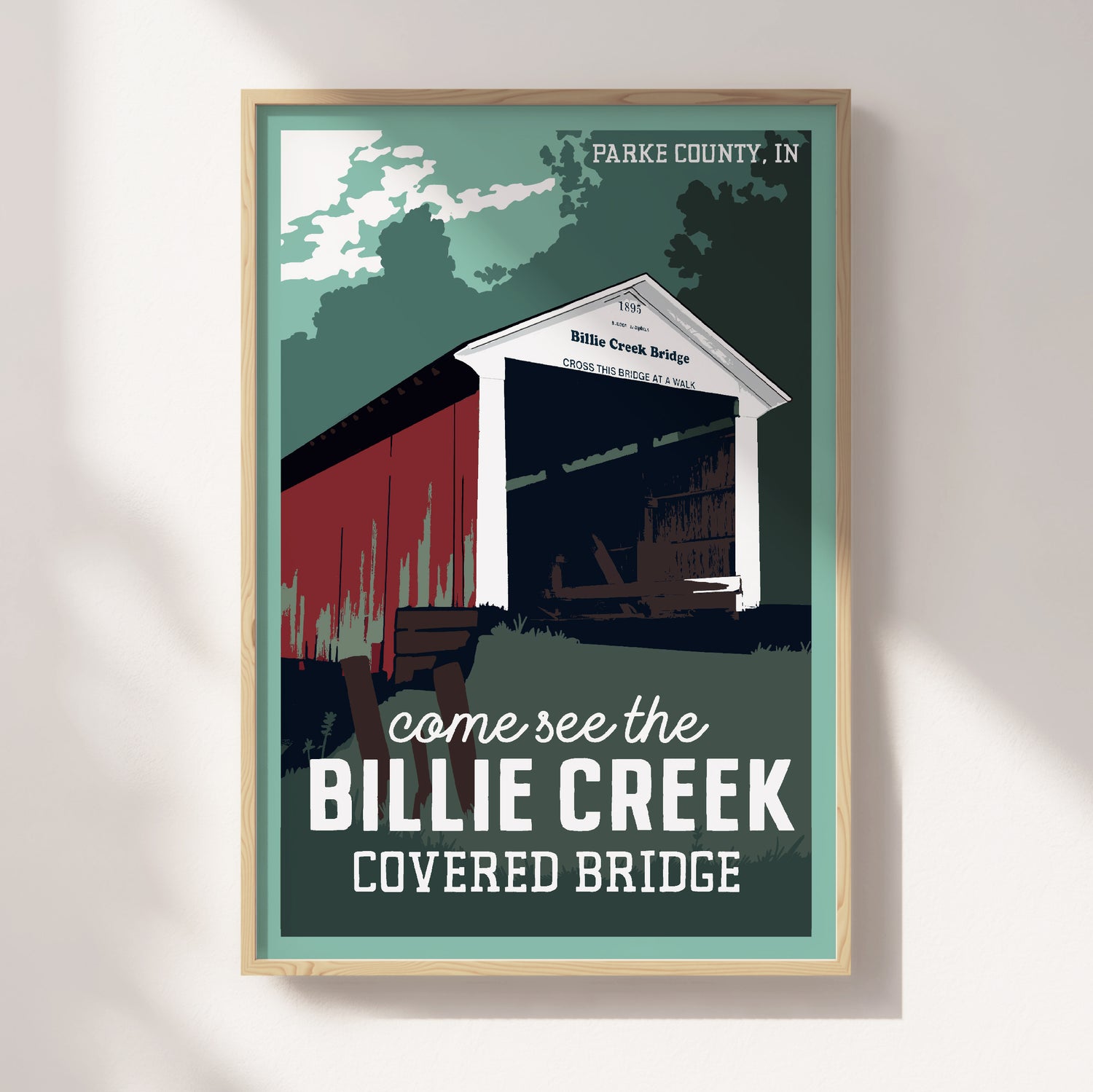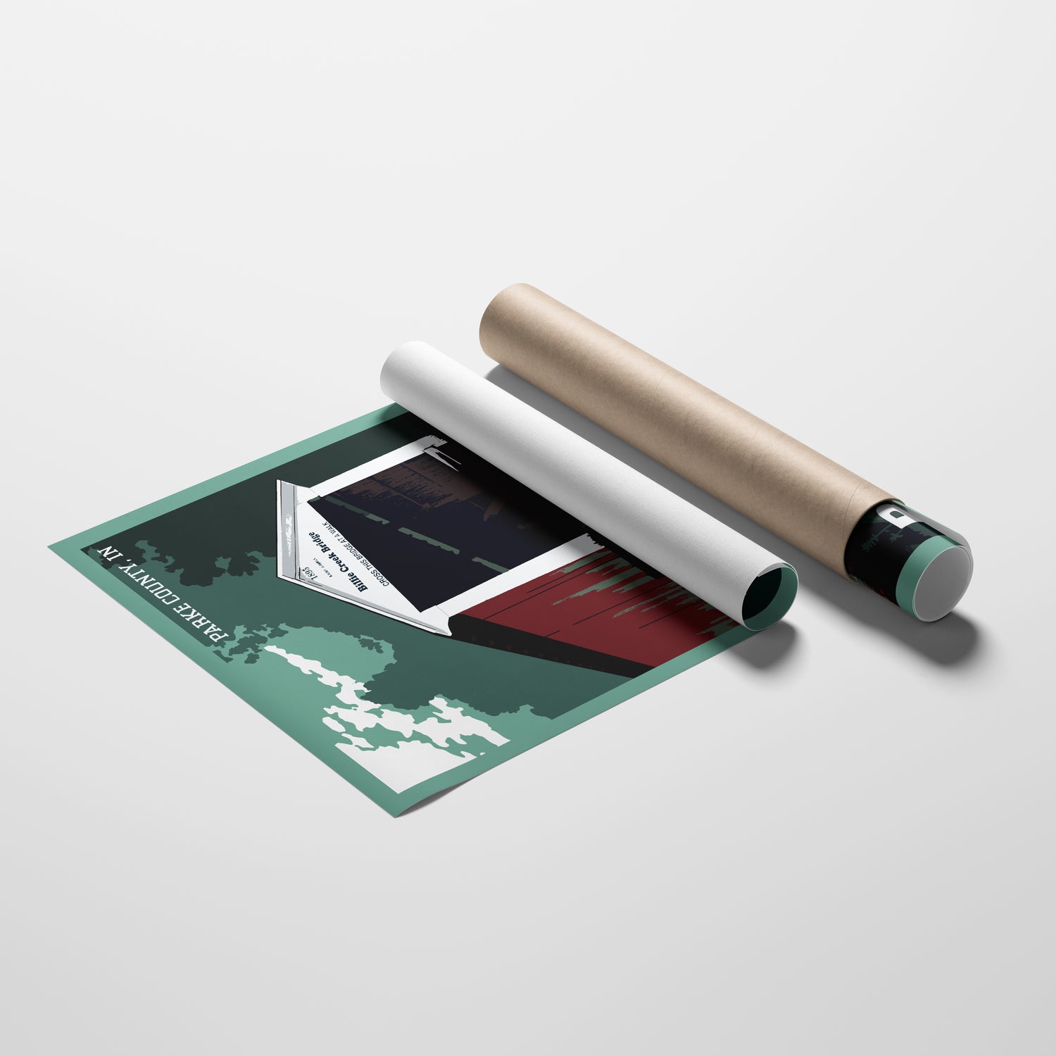 Hand drawn travel poster of Indiana's Covered Bridges printed on beautiful matte paper.