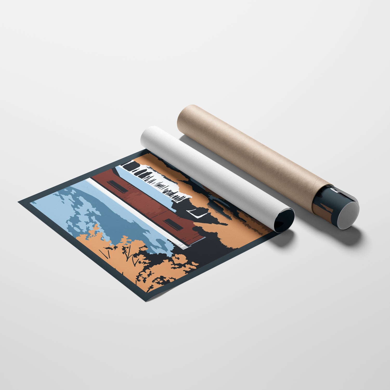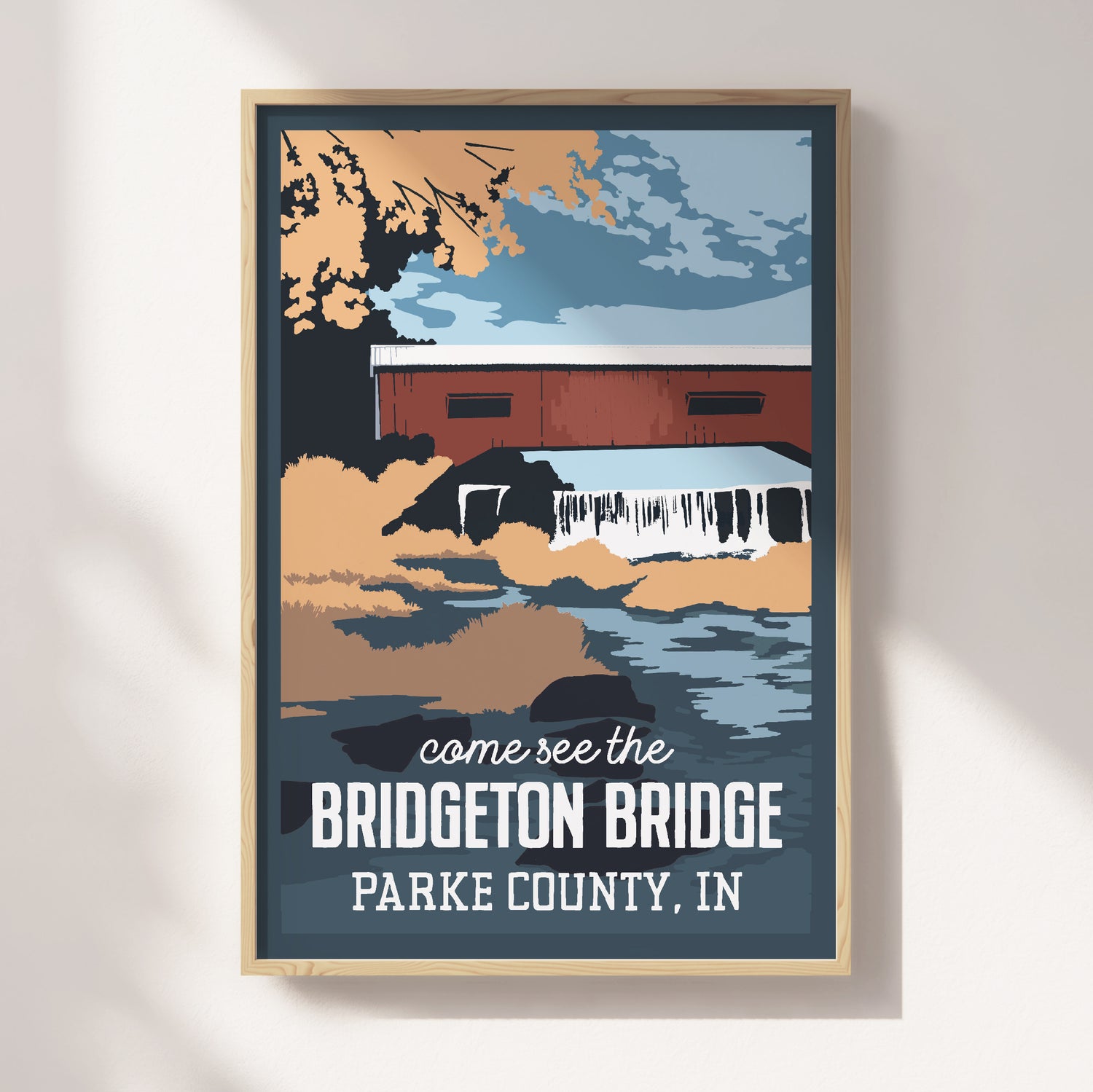 Hand drawn travel poster of Indiana's Covered Bridges printed on beautiful matte paper.
