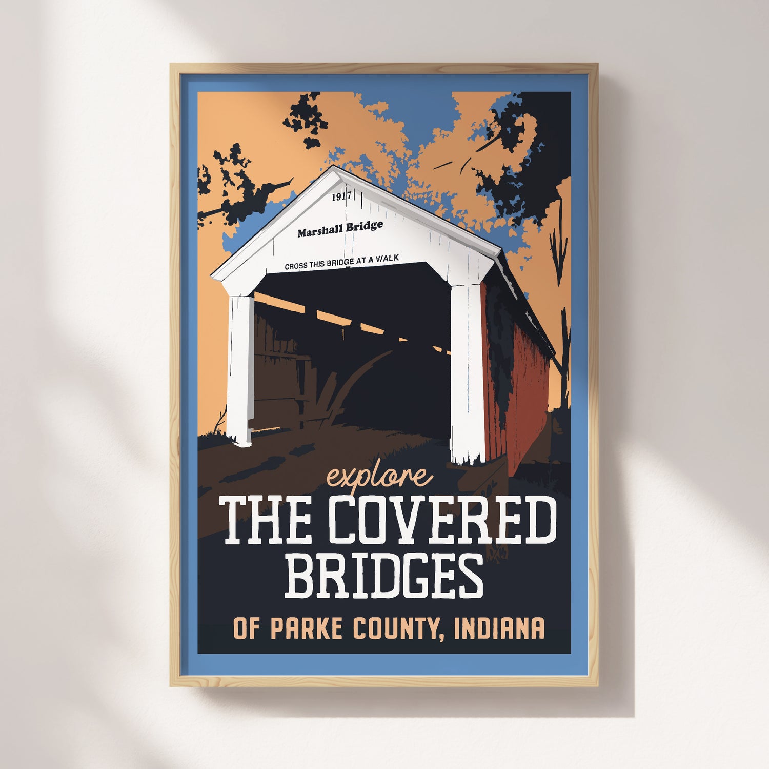 Hand drawn travel poster of Indiana's Covered Bridges printed on beautiful matte paper.