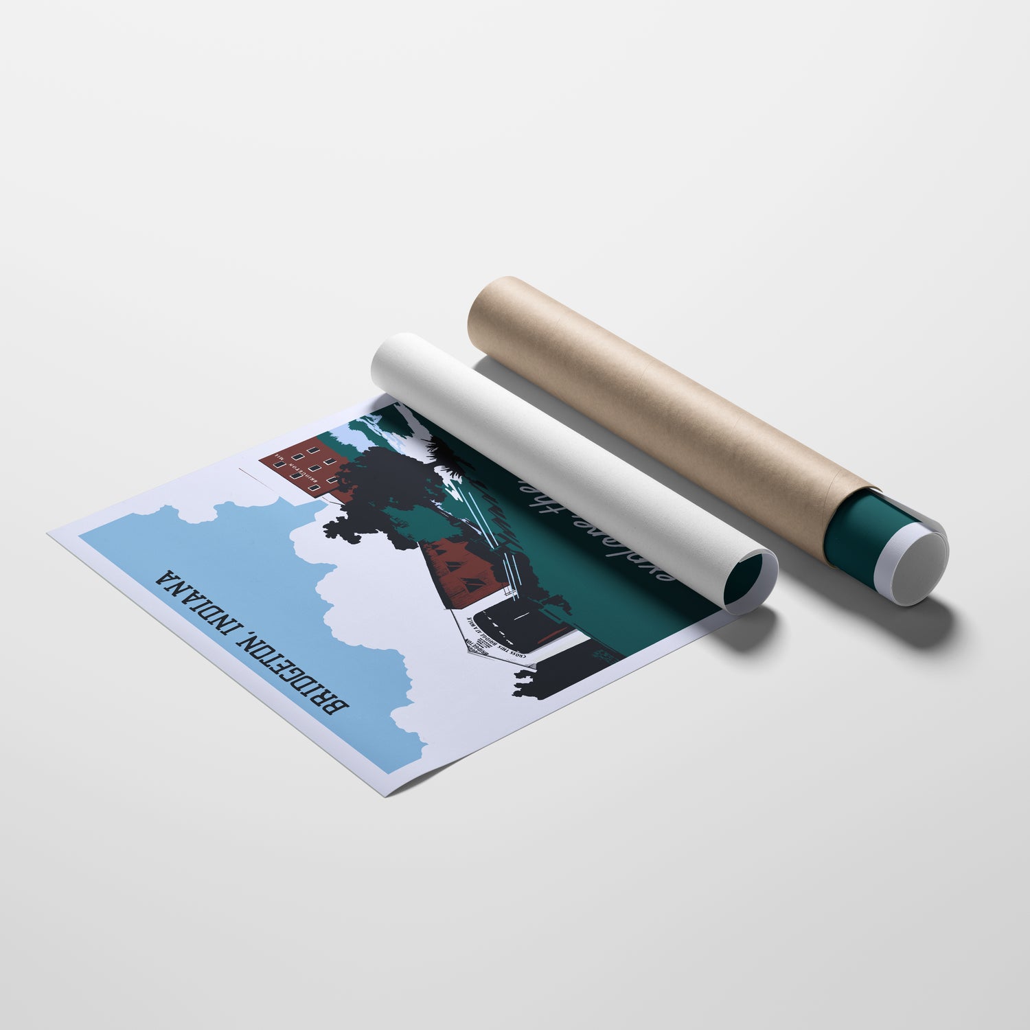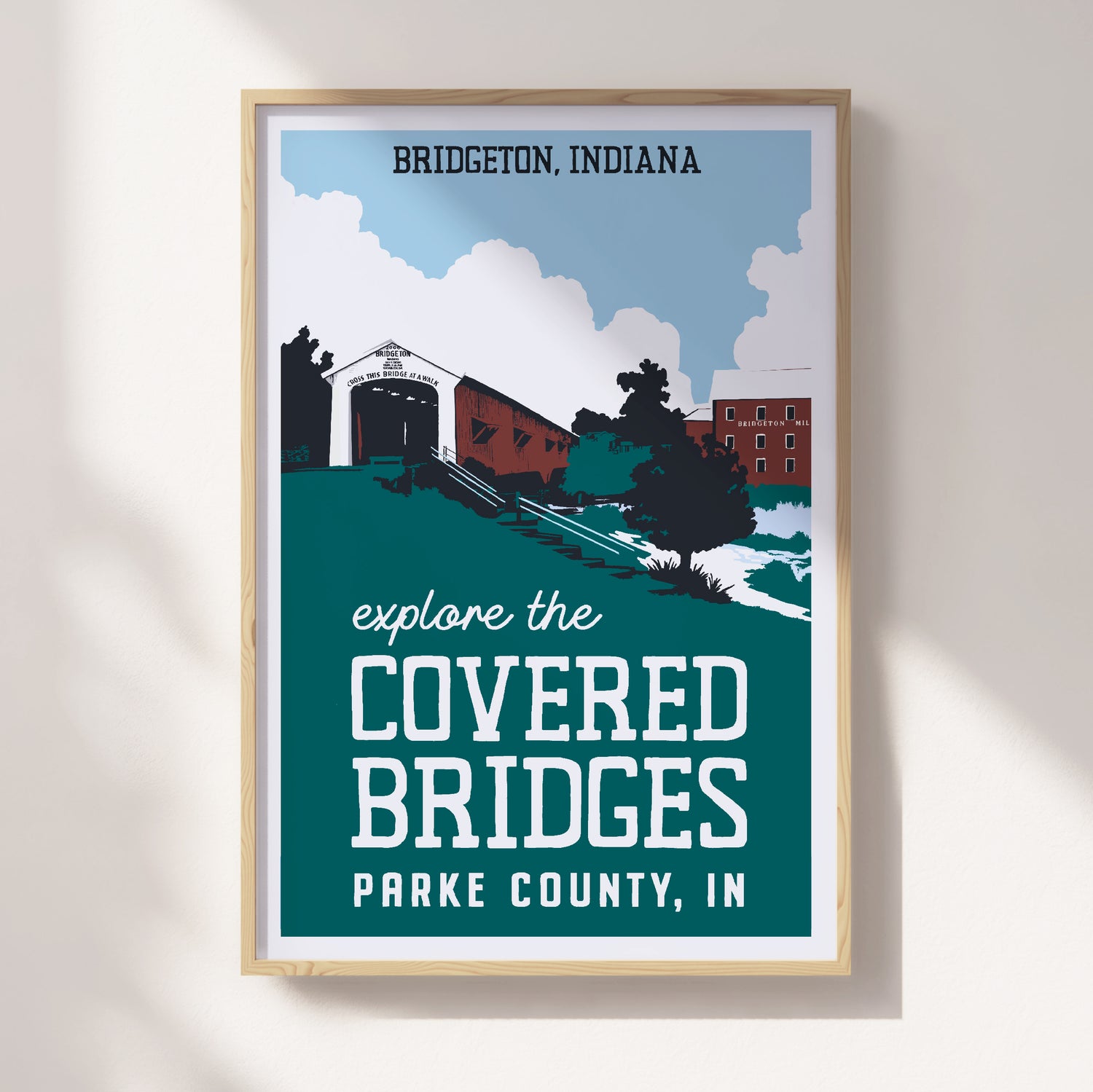 Hand drawn travel poster of Indiana's Covered Bridges printed on beautiful matte paper.